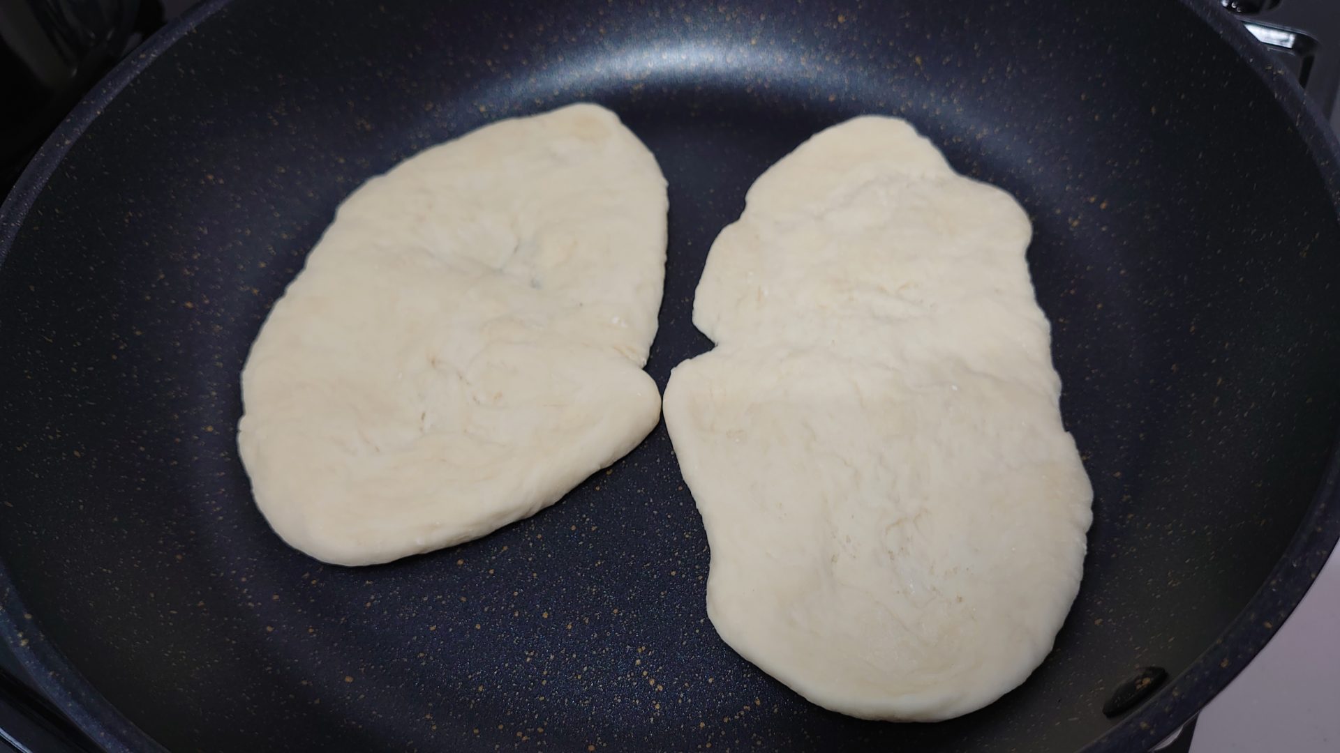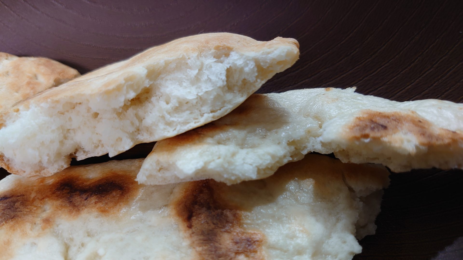 左がノンフライヤーで右がフライパンです。フライパンで焼いたほうは密度が高くいかにもナンって感じ。イメージ的にはノンフライヤーで焼いたほうはピザのクラフトに近いと思います。生地の薄いイタリアンクラフトではなく昔ながらのモッチリとしたクラフトの耳の部分。