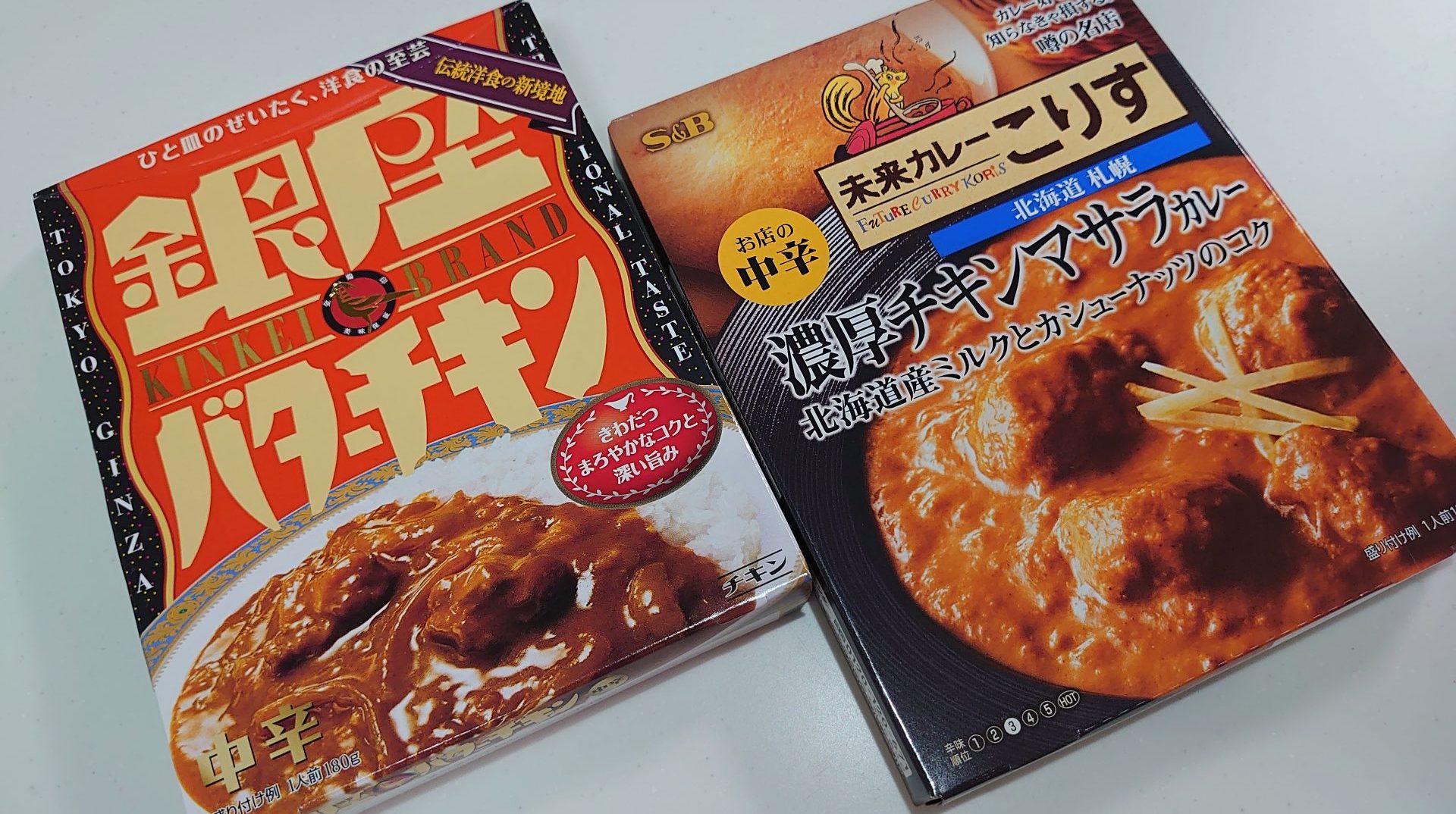 今回はこちらのカレーとセットでいただきます。なんとなくインドカレー屋で出てきそうなバターチキンカレーとチキンマサラカレー(偏見)。