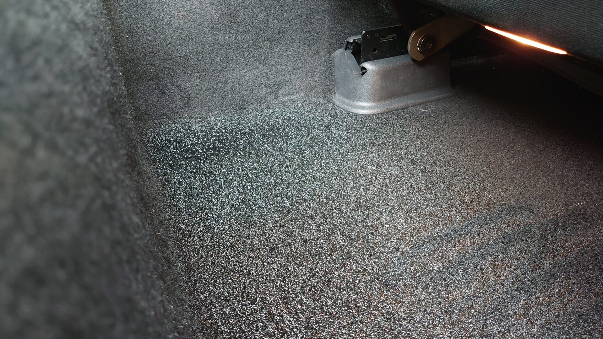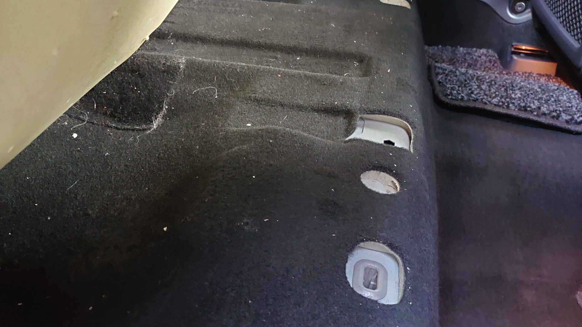 雨の日の帰り。なんとなくフロアマットに付いていた髪の毛を捨てようとしてつまんだところ、何やら湿っぽい感触が…。このときの嫌な予感は100%命中するわけで、案の定フロアマットをめくるとビチョビチョになっていました。いわゆる浸水ってやつ。被害を受けたのは後席右側だけ。それ以外の座席や足元は濡れていないので、ほぼ局地的に浸水していたことになります。