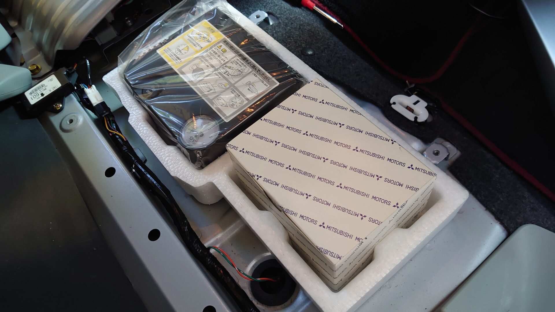 タイヤの空気入れはAmazonで検索すればいくらでもでてきますが、考えてみればアイには応急パンク修理キットが搭載されているので、応急パンク修理キットがあるならコンプレッサーも入っているだろうと目論んでいたら見事に的中しました。