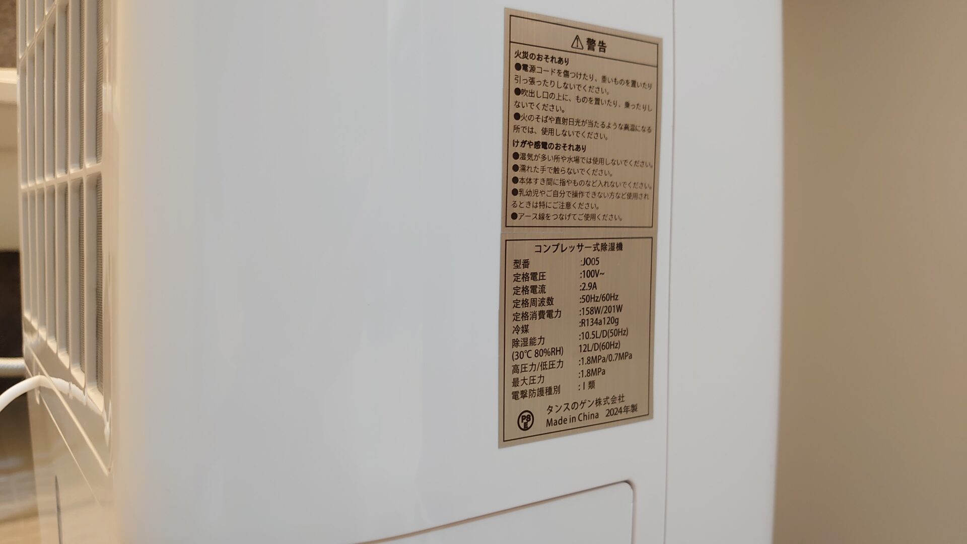 実はタンスのゲン自体の存在は昔から把握していました。Amazonで「マットレス」や「家具」で検索すると割と高頻度でタンスのゲンに遭遇します。このような経緯から「タンスのゲン=家具屋さん」のイメージが強かったので、除湿機でヒットしたのは意外でした。中華製が猛威を振るう家電業界にあって正しい日本語が記載されている貴重な製品です。