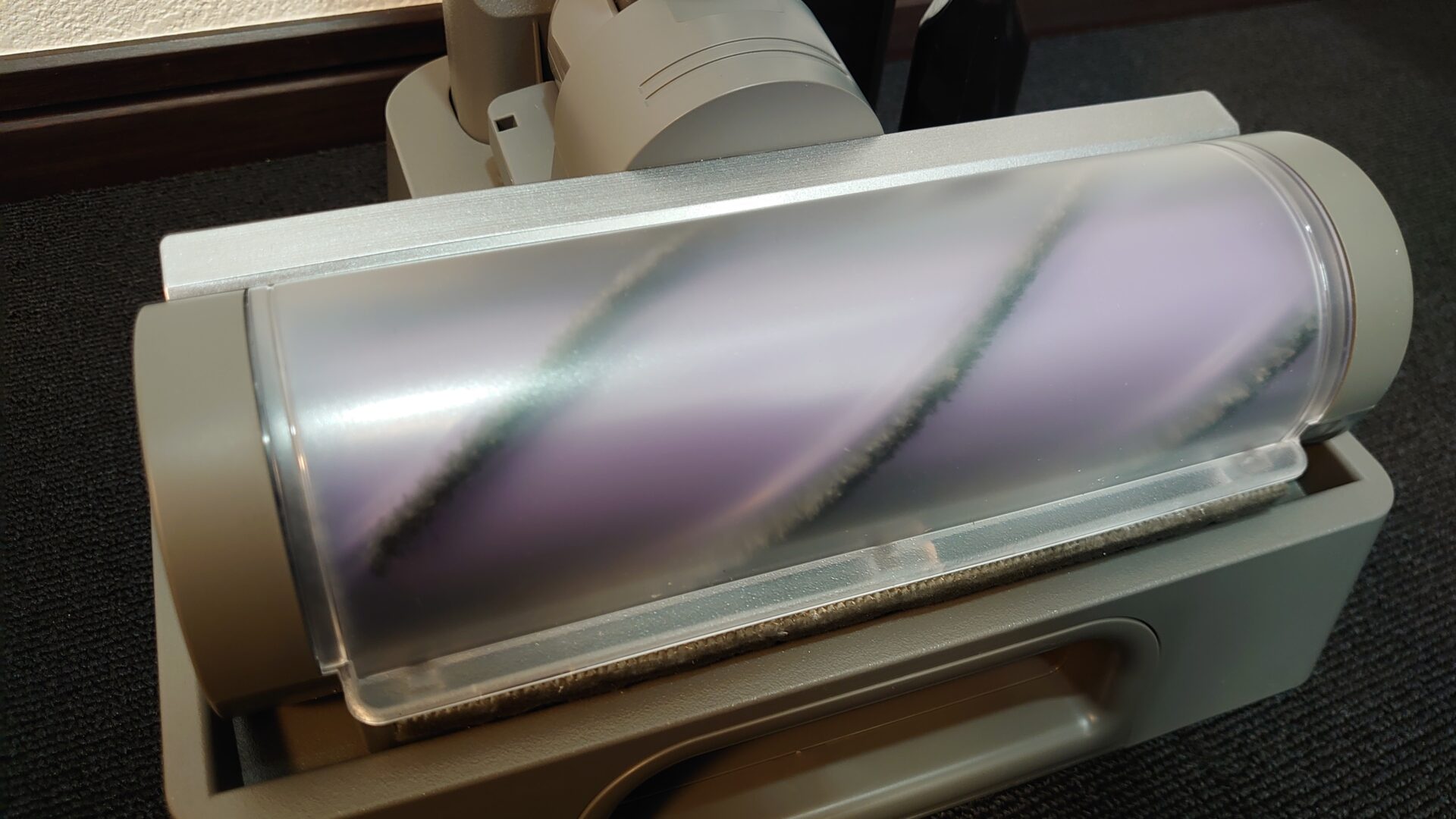 こちらがSUUZE最大のトピックでもある高性能モーター内蔵のパワーヘッド。「絡みにくいブラシ」で髪の毛などが絡みにくい構造になっているそうです。歴代のアイリス製掃除機と比べても一回りほど大きな印象。今回購入したのはグレーモデルですが、ホワイトモデルの場合はパワーヘッド部のブラシが薄いグリーンの配色になります。
