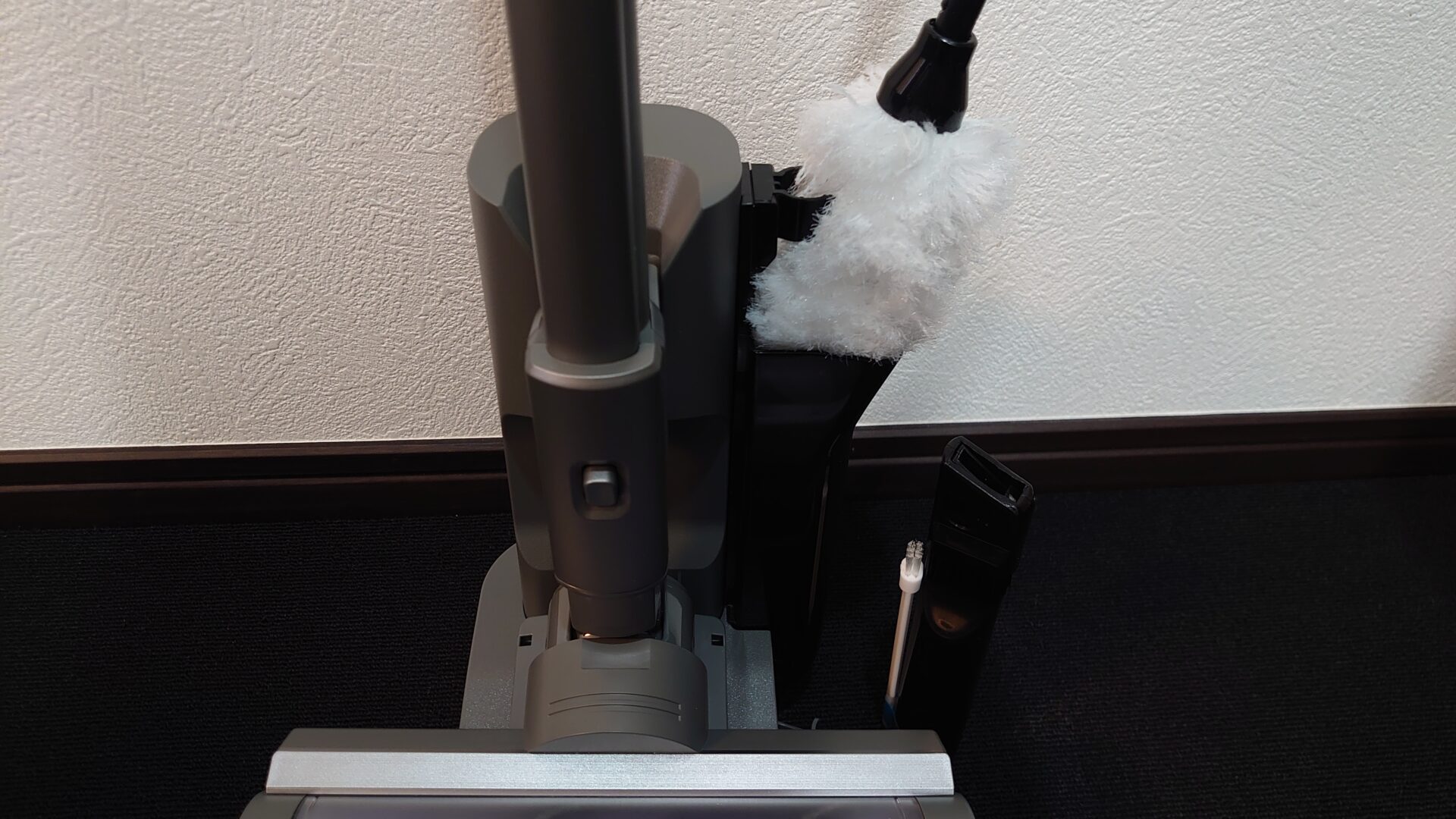 静電モップやアタッチメントノズルは充電スタンドに収納することができます。お手入れ用の小型ブラシが「つくし」とか「キノコ」みたいで可愛いです。