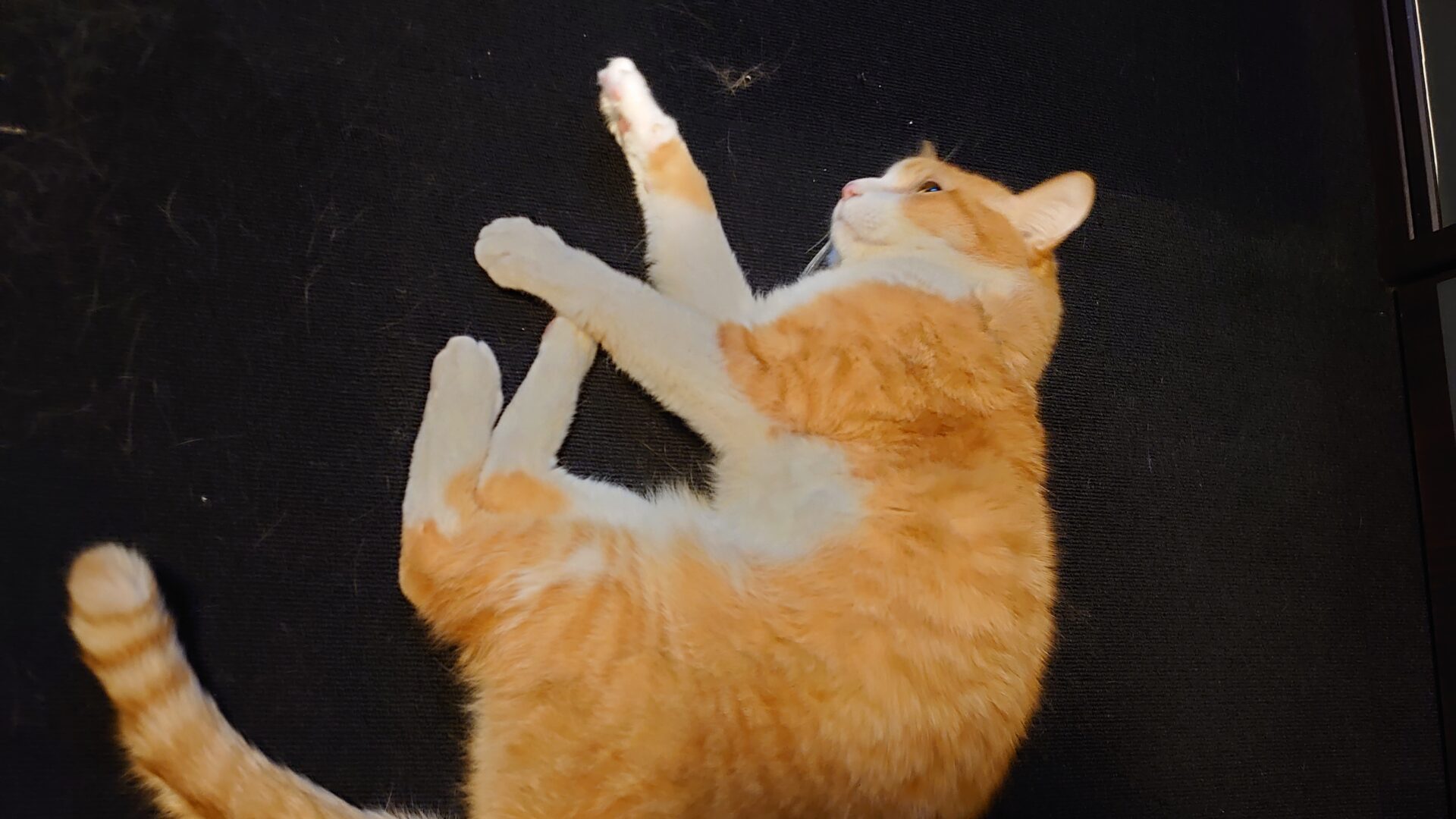 それではSUUZEの実力を試してみましょう!ネコのみぃちゃんに協力してもらい、タイルマットに毛を擦り付けてもらいます。よくこのように寝転がってスリスリしています。スリスリ⋯。