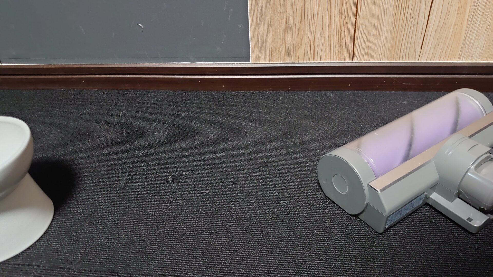 どうやらカーペットに落ちたペットの毛も吸い取れるらしく、フローリングを傷つけたくがないために全面にタイルマットを敷いてしまった我が家の環境にとってはまさに救世主的な掃除機とも言えます。なんだかんだでペットの毛はタイルマットに絡まりやすいので、Dysonだろうがキャニスター式であろうが取れないものは取れないと諦めていました。