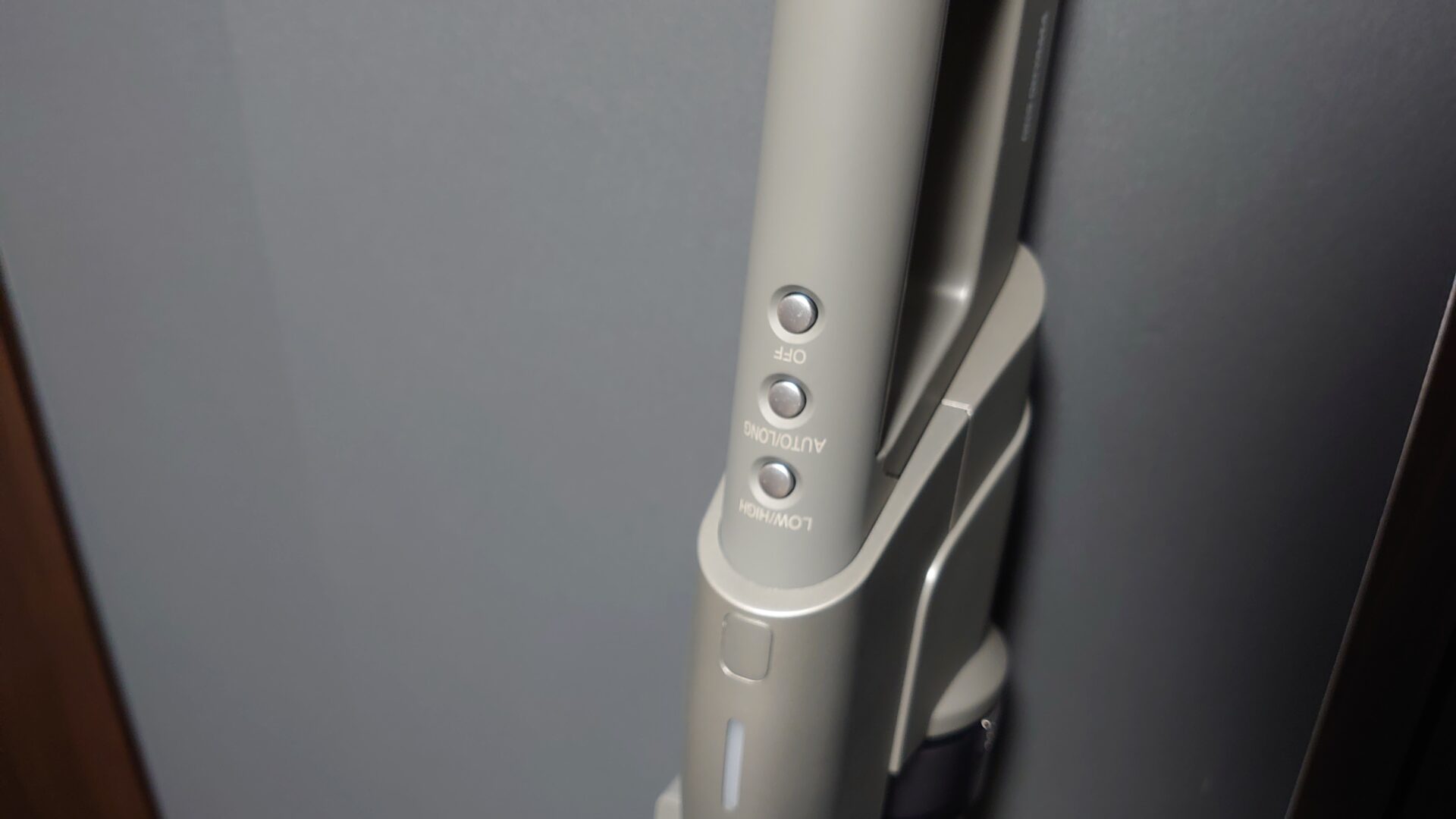 スイッチ類は上から(取っ手を握った状態から)LOW/HIGH、AUTO/LONG、OFFという配置。取っ手に角度がないのであまり握り勝手は良好とは言えません。軽いので大した問題ではありませんが、長時間使用すると多少は疲れるかなって感じ。ボタンも誤操作防止のためかフラットに近いので、ボタンを押し込む動作が必要です。