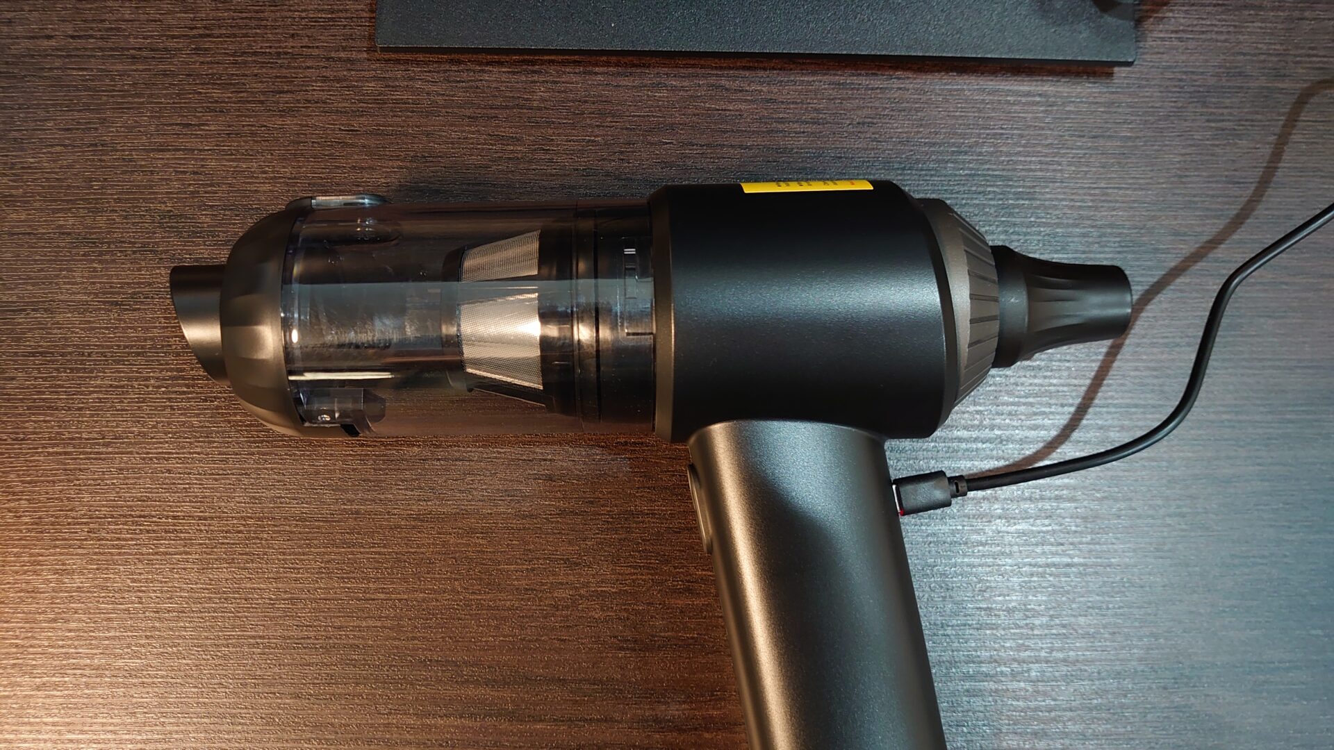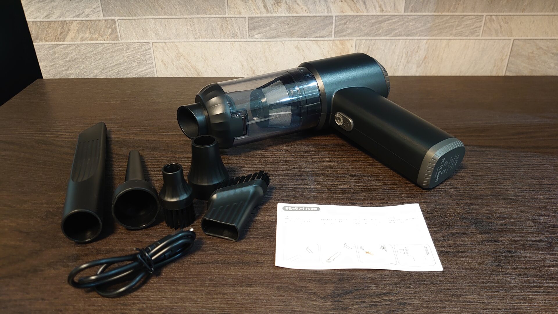 掃除機本体はそこそこコンパクトです。写真と色味が異なるのは深センで製造されているOEM品の由来でしょう。基本設計はそのままに、デザインや付属品を絶妙に変えて販売しているだけなのでどれも似通った仕様になります。本体や付属品のどこにもメーカー名や型番が表記されていないのは怪しい中華製ガジェットあるあるで、同じ製品を他社で使い回すには都合が良いからです。