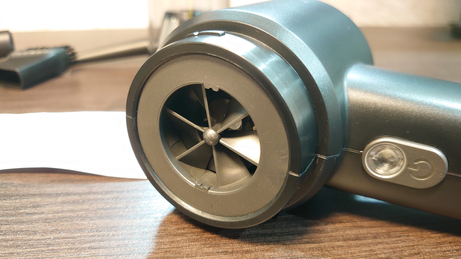 前方は通常の掃除機として使用する吸引、後方は吸引の排気を利用したブロワーになっています。構造的にはドライヤーの前後を逆にしたイメージですね(ドライヤーは前方がブロワー、後方が吸引)。全体的な質感はやはり悪いです。ただし元々が1,900円という価格なので質感に関しては特に言うことはありません。何せ原価は数百円ですから⋯。