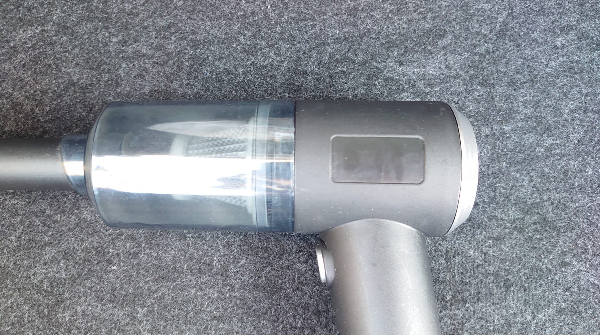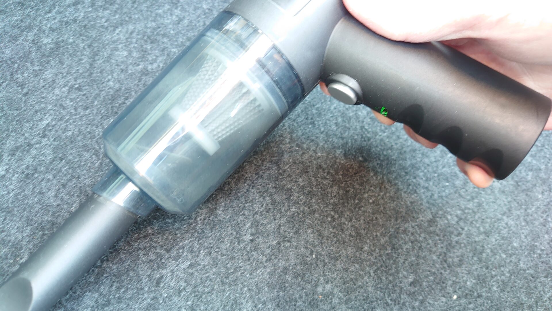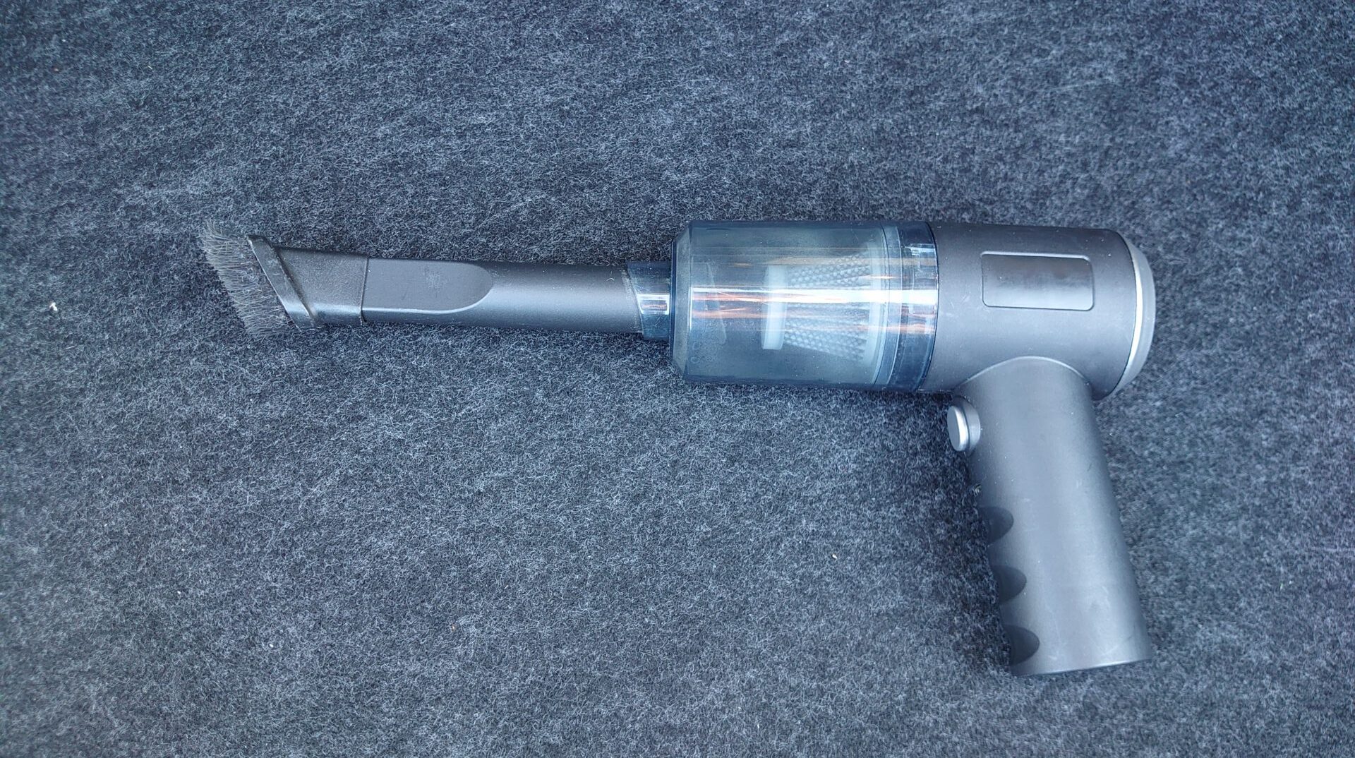 付属のノズルとブラシを装着するとありきたりな掃除機の姿になります。本体の大きさはトリガーの部分を除けば近年のiPhoneよりもコンパクトです。基本的に掃除機の吸引力はモーターのサイズに依存するので、スマホならともかく掃除機でここまでコンパクトとなるとやはり吸わない可能性が高いですね。