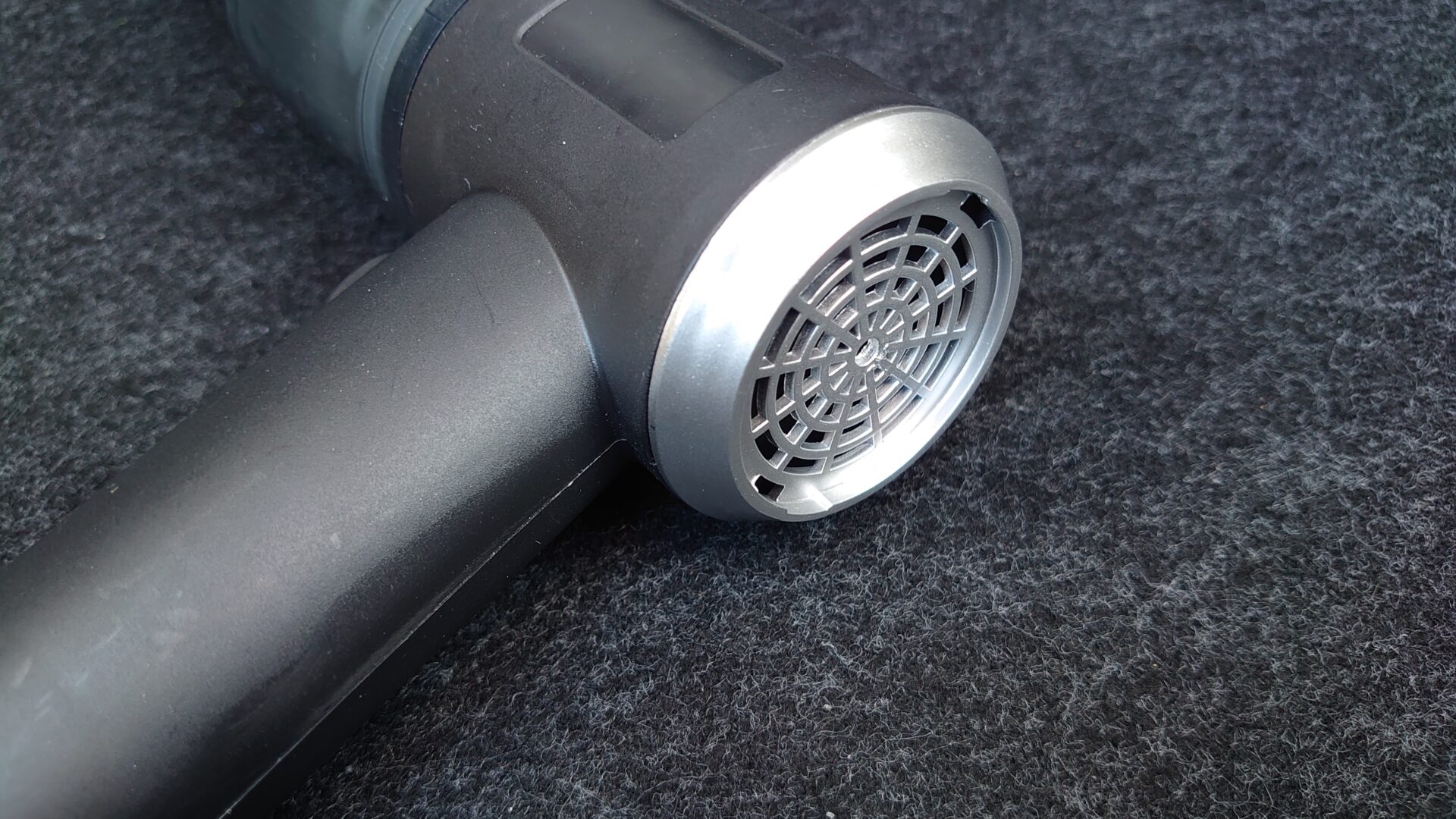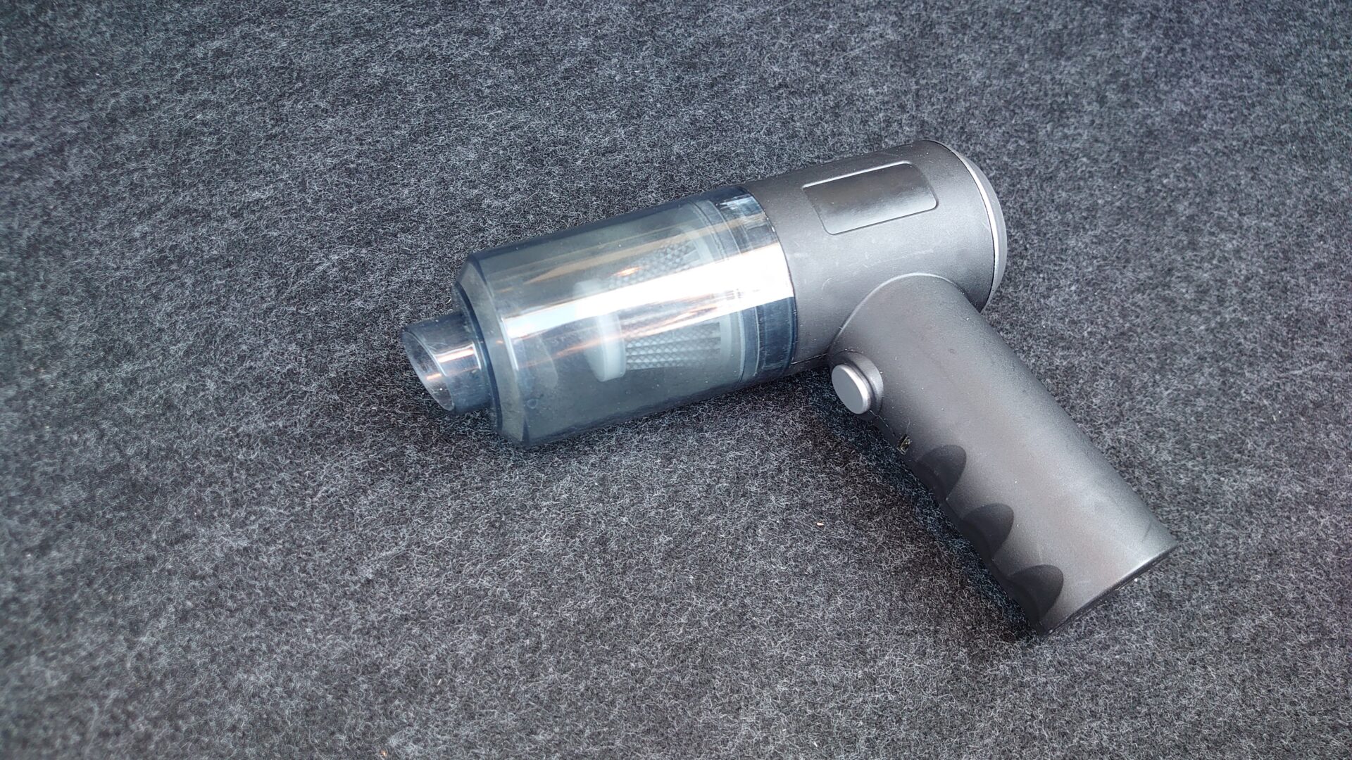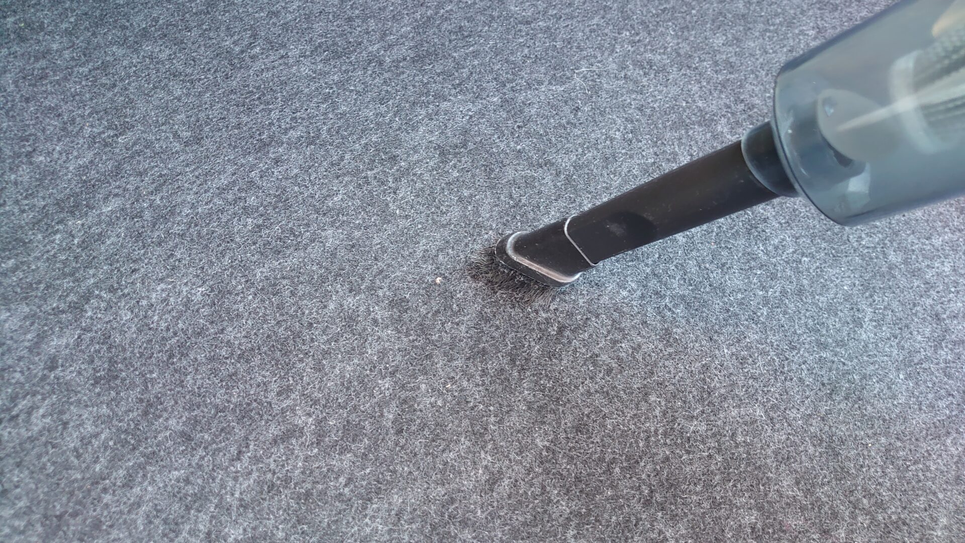 付属のノズルとブラシを装着するとありきたりな掃除機の姿になります。本体の大きさはトリガーの部分を除けば近年のiPhoneよりもコンパクトです。基本的に掃除機の吸引力はモーターのサイズに依存するので、スマホならともかく掃除機でここまでコンパクトとなるとやはり吸わない可能性が高いですね。