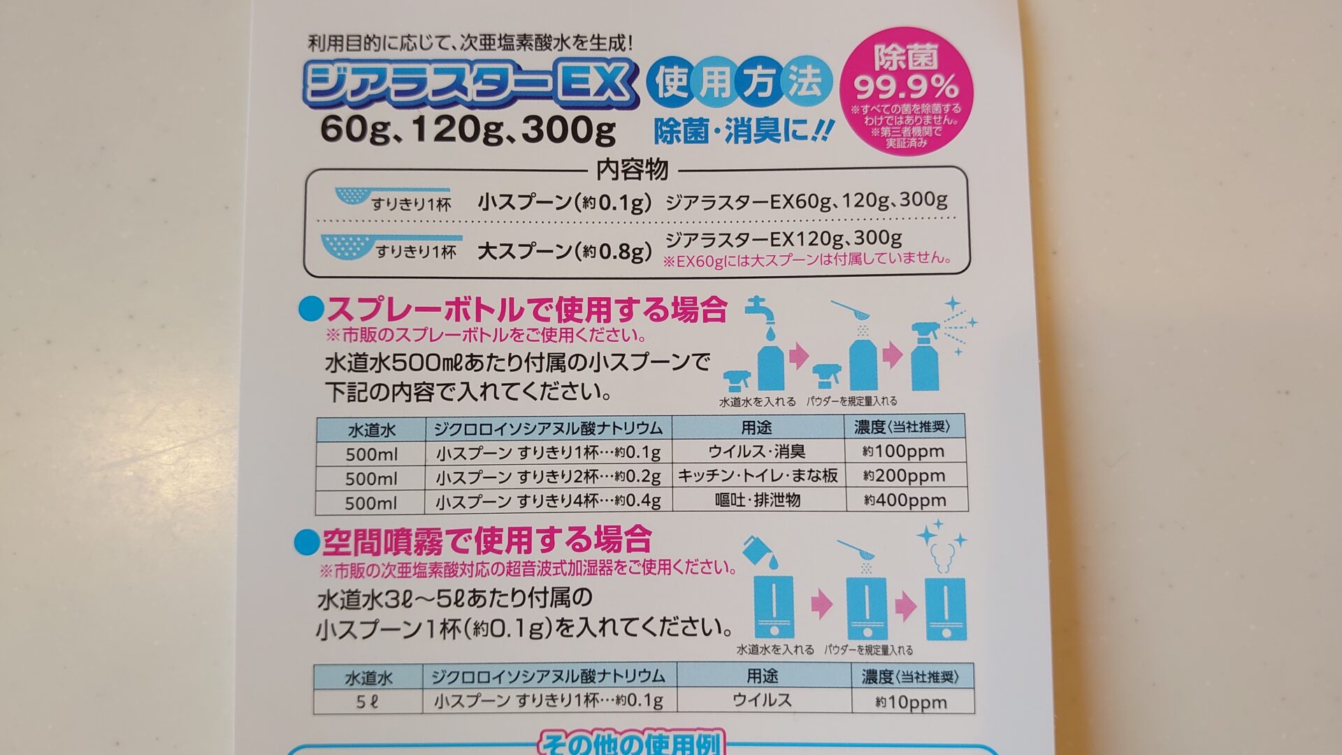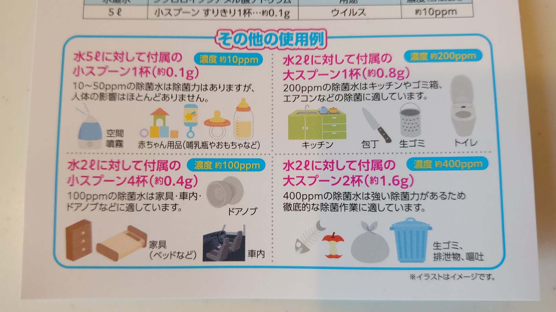ちなみに500mlのペットボトルに小スプーンすりきり4杯(0.4g)を溶かすことで400ppmの高濃度次亜塩素水を生成することができ、これは嘔吐、排泄物、生ゴミにも効果があると記載されています。実際にオムツの排泄物にスプレーしてみると、一瞬で匂いがなくなるほど強烈な消臭効果を確認できました。本当に凄い消臭力!