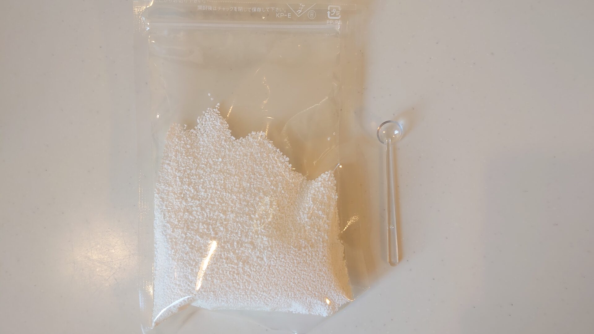 中身はこのように顆粒の粒と小スプーン(すりきり1杯約0.1g)が付属。今回購入したのは120gなので、単純計算するとウイルス殺菌用のスプレーボトルだけに限れば1,200回分使用できることになります。価格はAmazonで1,400円だったので、1ボトルあたり約1.1円のコストです。市販の生成水タイプを購入するより圧倒的にコスパが高いですよね。