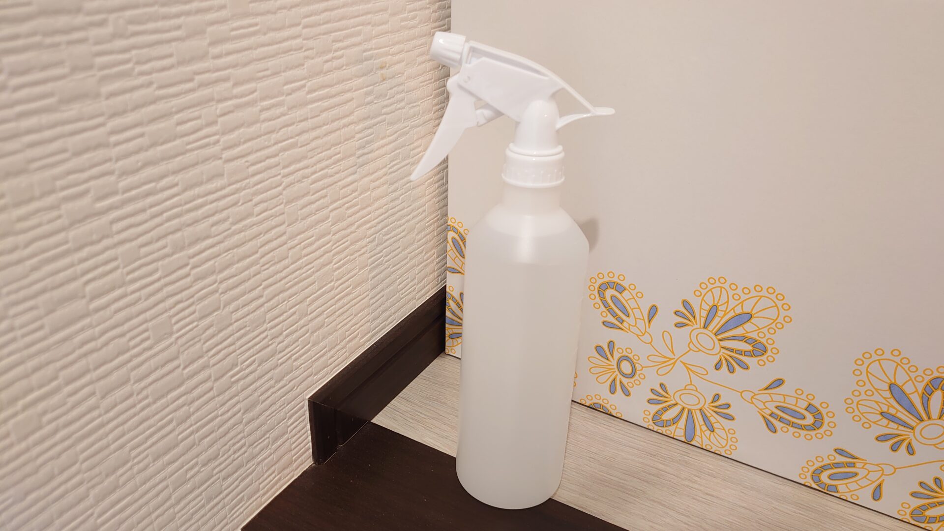 400ppmの高濃度次亜塩素水のスプレーボトルはトイレに置いてあります。主に便器の清掃や空間除菌用に常備している感じです。