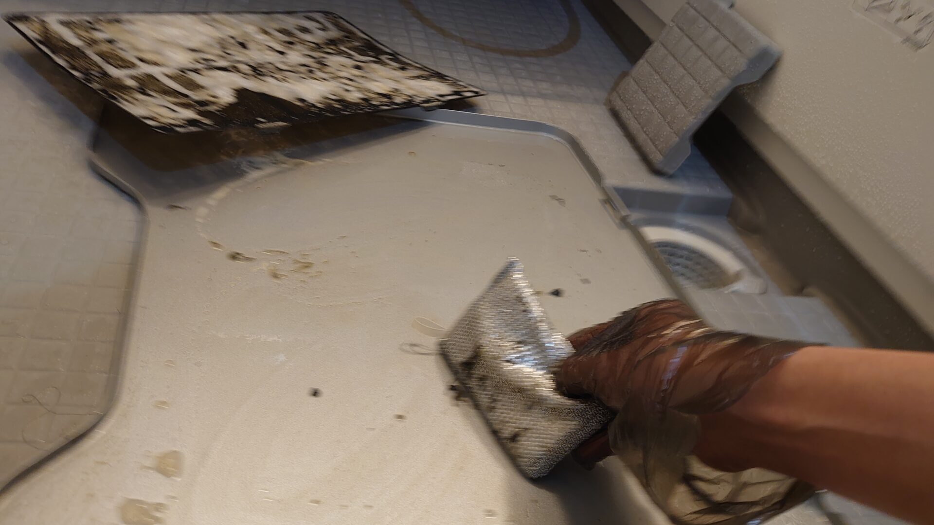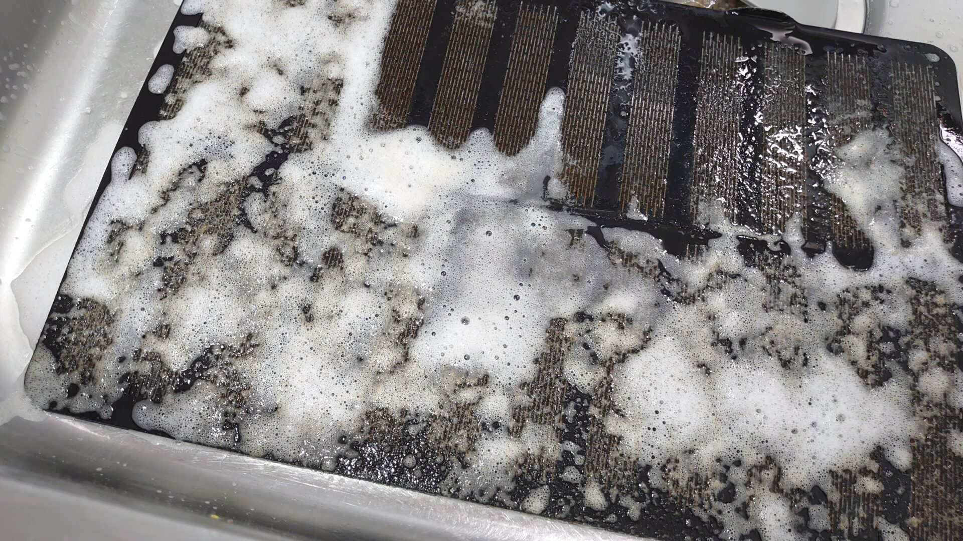 さっそく油の付着が一番ひどいフィルターを掃除していきます。表面にこびりついているのは埃単体ではなく、蓄積した埃に油が融合したギトギト系(もしくはネチャネチャ系)の油汚れです。こいつには食器洗い洗剤のような生半可なものでは全く効果がなく、今まで何個もスポンジをダメにしてきました。ですが今回は化学の力でなんとか乗り切りたいと思います!